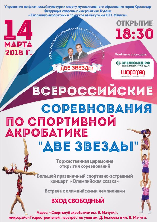 03 марта 2018 14-16 марта 2018 года. Две звезды.Всероссийские соревнования по спортивной акробатике. 14-16 марта 2018 года. Две звезды.Всероссийские соревнования по спортивной акробатике. Поделиться: